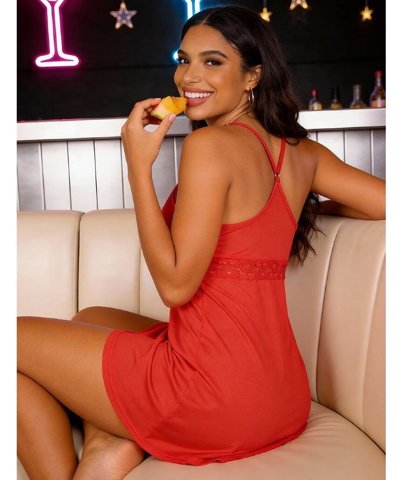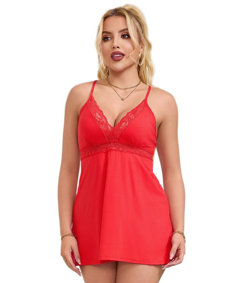 Curvy Modal Lace Deep V-Neck Suspender Nightdress - Red